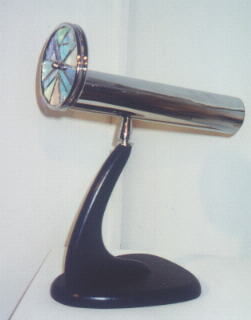 Brass scope in rounded rectangular body, with wood stand that holds 2 more wheels. All together 4 interchangeable wheels. 10" high x 11" wide, 5" deep Two wheels are on the scope for a total of 4 wheels.