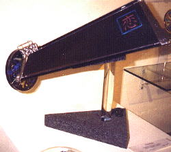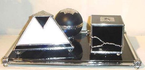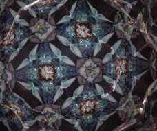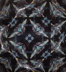 Triangular sides of kaleidoscope are accented with small black and white triangular glass piece. Mirror had two mirrors which produces a triangular image of 3 points, Oil filled black background cell has dichroic glass. Limited Edition of 100 PRICE: $249 COXXX |