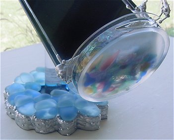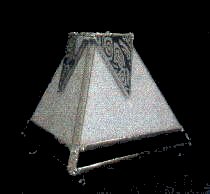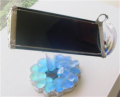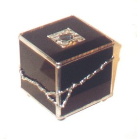 Stained glass body, with decorative solder, oil filled cell under the box that revolves, 2 mirror system that creates a four point square image. Size is 4" cube. ARTIST: Sherry Moser PRICE: $249 COXXX Can be Specially ordered