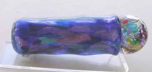 Blown glass body with dichroic glasses, blown orb liquid filled with strands of glasses, 3 mirror system 8" x 2.5" PRICE: $419 OSXXX |