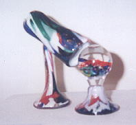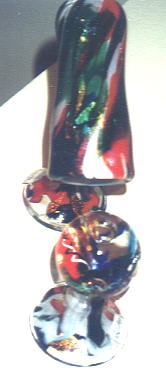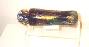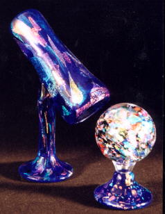 Handblown glass body with dichroic glasses and orb liquid filled with drawn and blown glasses and dichroic / with stand. 8" x 2.5" PRICE: $419 |