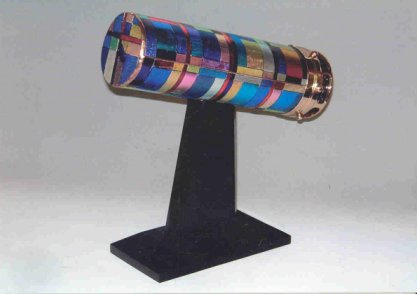 Inside Out Fused Dichroic Glass, Brass Liquid Cell. Lampworked Glass Pieces 15" x 15" x 4" PRICE: $3,200 |