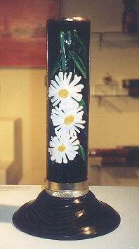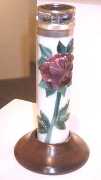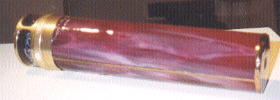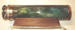 With many years of glass working experience between them, these two have created a unique kaleidoscope pattern of round slumped, fused glass. All their kaleidoscopes are this basic pattern with some having flower patterns fused onto the glass pattern before molding it to it's rounded shape. Their object case is glycerin filled with hand made lampworked and blown glass pieces that coordinate with the color of the exterior kaleidoscope body.