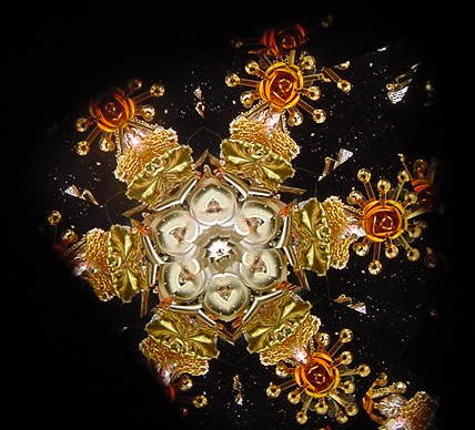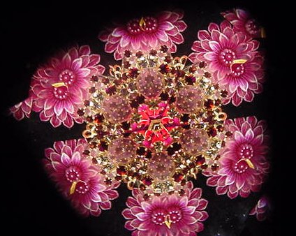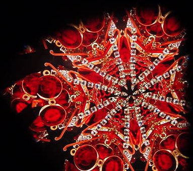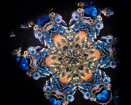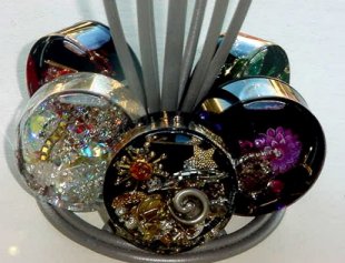 Bijoux Wrought Iron, covered in a plasticized grey finish (no rusting),yet light weight to handle and hold. This scope come with 6 pucks, shown below (as well as pictures of interior of scope through most pucks). The pucks just slip into the holder on the front, and eaisly move with a fingertip. No twisting or wrenching needed to seat the puck. Pucks from other Judith Paul Scope "It's a Wrap" will fit this scope and are interchangeable. Additional pucks can be ordered The arrangement of the pucks at the bottom are thought to resemble flower petals. Pucks stay in place while picking up and moving kaleidoscope. Scope is 19" high and 8.5" wide. Pucks come in red, blue green, purple, gold diamond (with clear backing on last puck) PRICE: $1,200 |