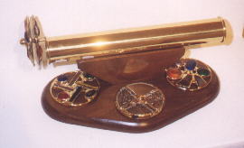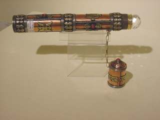 Jewel Under the Lotus" 11" x 2", Brass The casing of this Kaleidoscope is a Tibetan incense holder and is decorated with symbols of Power, Health, and Spiritual Harmony. The chamber contains semi-precious stones, including: Amethist,Aquamarine, Citrines, Garnet, Iolite, Pink Tourmaline and Peridots. Wrapped around the cap is the Mantra of compassion: “Om Mani Padme Hum”, which is translated in English with: “The Jewel under the Lotus”, hence the name of the Kaleidoscope. The two mirrors optic creates a star with eight points, one for each of the mantra’s syllables plus two representing the opposing forces that create harmony (light and darkness, good and evil, day and night...).The eight points of the star represent the duality of essence as well as the six (again the Mantra’s six sillables) negative emotions: Pride,Jealousy, Desire, Ignorance, Greed and Anger, and their redeeming positive virtues: Generosity, Harmonious conduct, Endurance, Enthusiasm, Concentration and Insight. Meditating on each of these eight points, you may reach a blessed state of harmony and balance. Or, maybe, you just want to enjoy the beauty of the Mandala and the calming effect of its oil chamber. In either case: have fun! ARTIST: Massimo Strino PRICE: $379 CAFXX |
