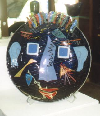 Fused Dark Blue glass with overlays 13.5" diameter x 2" deep