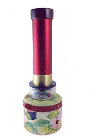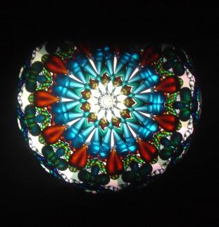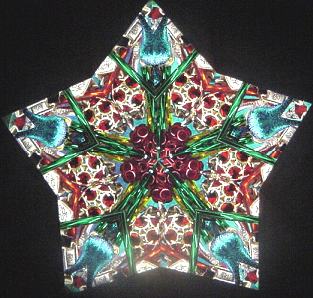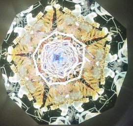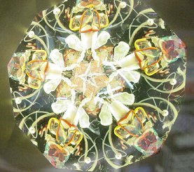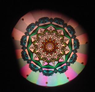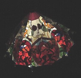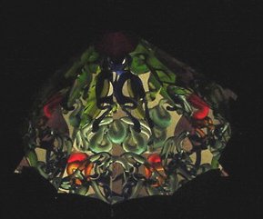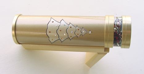 PAPER AND SILK 14" x 8" (table not included) ARTIST: David Kalish PRICE: $439 This is a gorgeous new kaleidoscope by the artists. It looks like a Japanese Shoji lamp. This kaleidoscope functions in an unusual way/ It uses neither a wet cell nor a dry cell - nor a wand or wheel. It actually focuses on a brightly colored hand dyed silk scarf which you slowly pull through the objective end of the large eight pointed two mirror system. You, as the viewer, can control the movement of the fabric and will have the ability to change the visual patterns and to transform the patterns you are seeing. |