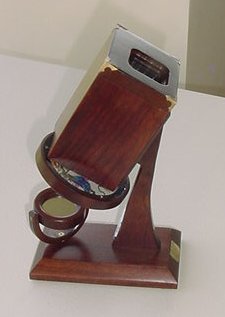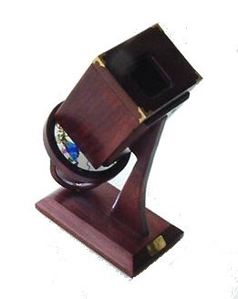 A unique scope, unlike any other we have seen. Height is 16", width 9" and overall length is 21". Weight is 15 lbs. 2 mirror, 5 star mandala, hand sculptured cherry wood table model with adjustable viewing height. Object lense is side lit with interchangeable lenses filled with silicon of 40-50 objects in case. Object lens is at a 40 degree tilt producing a 3 dimensional tunnel effect. It is signed and a limited edition of 200. It comes with an external light source and one object lense of your choice (black, white or gold background). Focal length is 16".